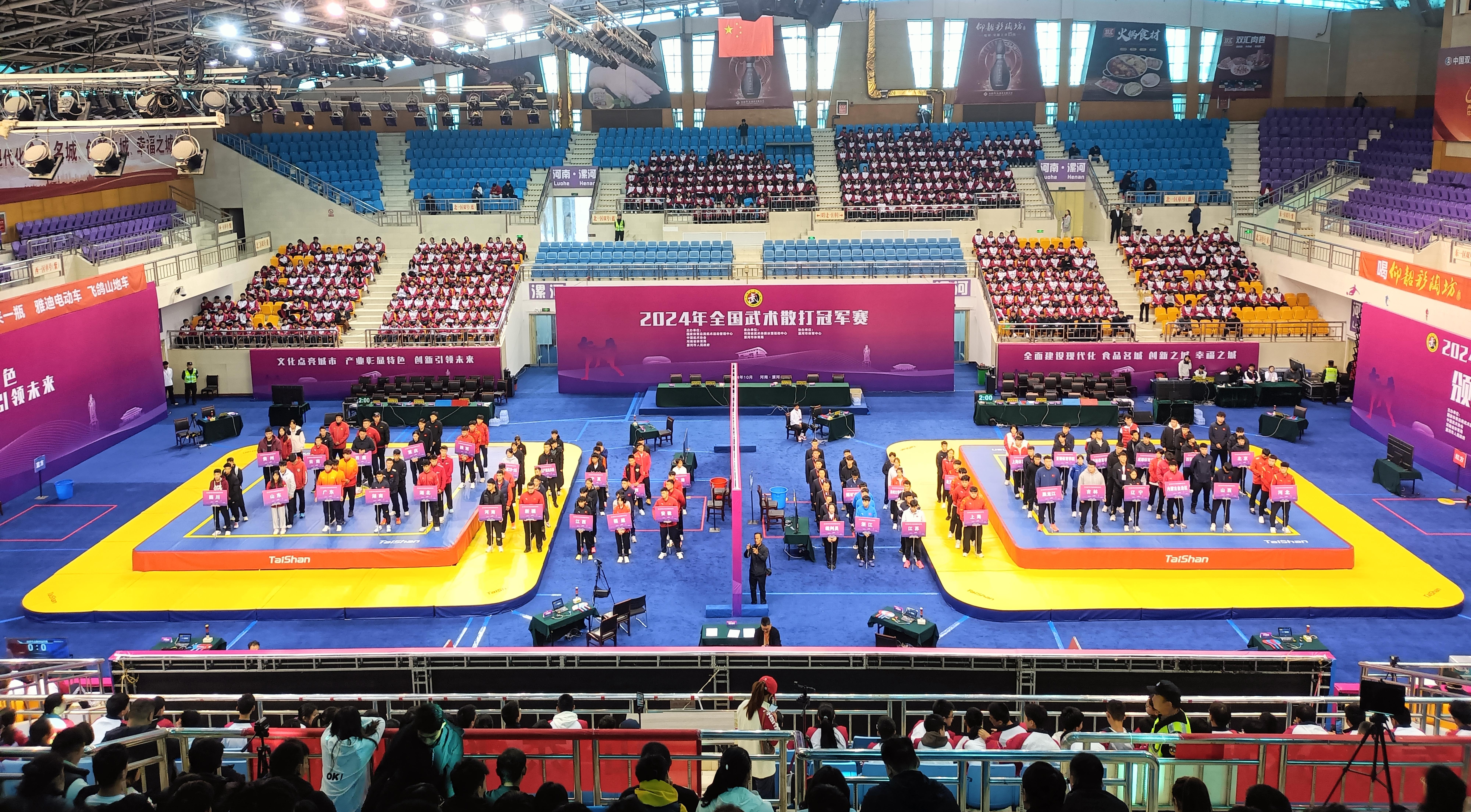 【概要描述】10月24日,全国武术散打冠军赛在河南省漯河体育中心体育馆开打,来自国内顶级40支代表队的近400名武术散打健儿汇聚漯河,给观众带来一场展现武术精髓的盛宴。K8凯发体育成为本届赛事场地器材、训练器材供应商与服务商。 国家体育总局武术运动管理中心副主任李永强,河南省体育局党组成员、副局长田间,漯河市副市长宋琰琰,国家体育总局武术运动管理中心武术搏击部主任张雷等领导出席开幕式。 全国武术散打冠军赛作为