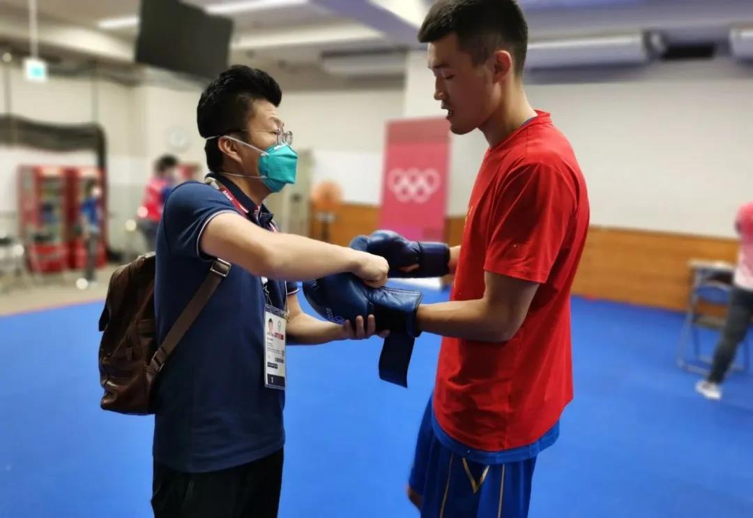 东京奥运会拳击热身馆,K8凯发体育工作人员帮助运动员穿戴拳击手套